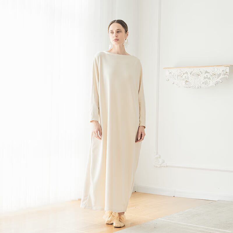 落ち感のある柔らかな素材が、女性らしいラインを美しく引き立て、特別な日にも日常にも溶け込む一着です。