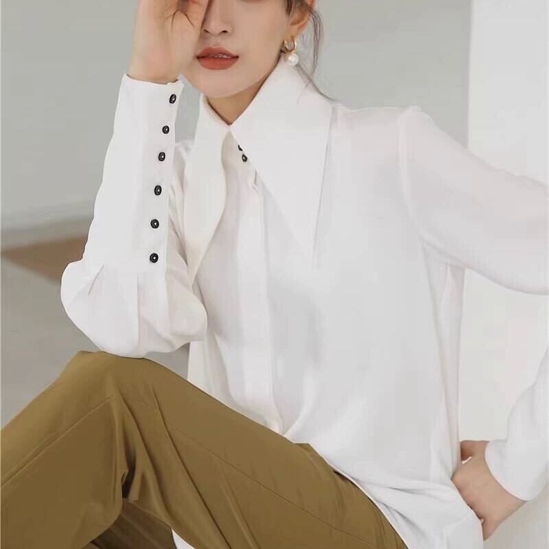 シンプルなデザインながらも、存在感のある襟がアクセントとなり、コーディネートを一段引き立てます。長めのスリーブに連なるボタンもポイントの一つ。パンツにもスカートにも合わせやすく、ニットなどのレイヤードスタイルもおすすめです。